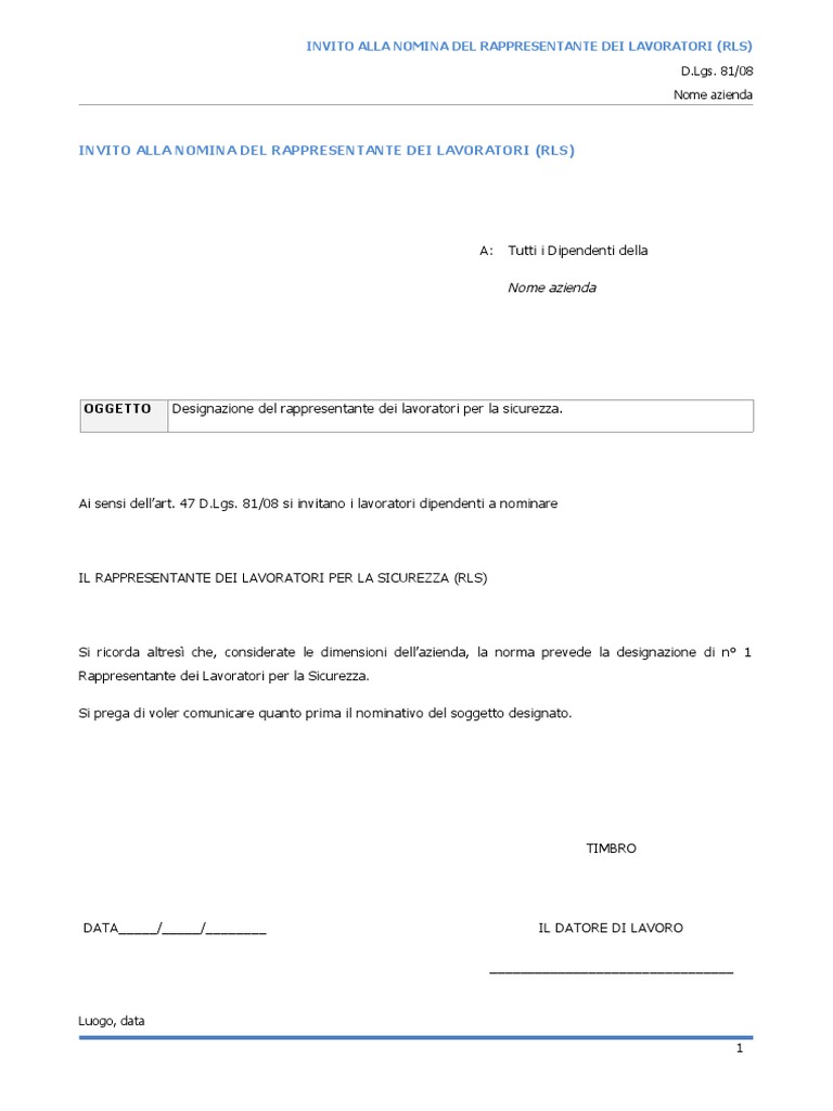 Mod. 02 - Rinuncia Alla Nomina Del RLS | PDF - Scribd Incorpora di 5 RINUNCIA NOMINA DEL RAPPRESENTANTE DEI LAVORATORI (RLS) D.Lgs. 81/08 Nome azienda RINUNCIA NOMINA DEL RAPPRESENTANTE DEI LAVORATORI (RLS) A Tutti i Dipendenti della Nome Azienda OGGETTO: Rinuncia alla nomina del Rappresentante dei Lavoratori per la Sicurezza VISTA